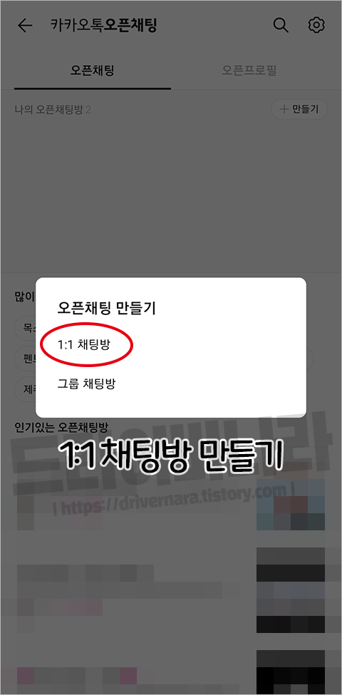 만들기 버튼을 누르면 채팅방 형태를 어떤 형태롤 만들지 선택하는 창이 뜹니다. 1:1채팅방과 그룹채팅방을 유형 중에서 선택할 수 있습니다. 1:1 채팅방은 말그대로 채팅방 주인 한 사람과 다른 익명의 오픈 채팅 이용자와 대화를 할 수 있는 형태입니다. 그룹 채팅방은 단체 채팅방으로 생각하면 쉽습니다. 저는 여기어서 1:1 채팅방을 만들어 보도록 하겠습니다.