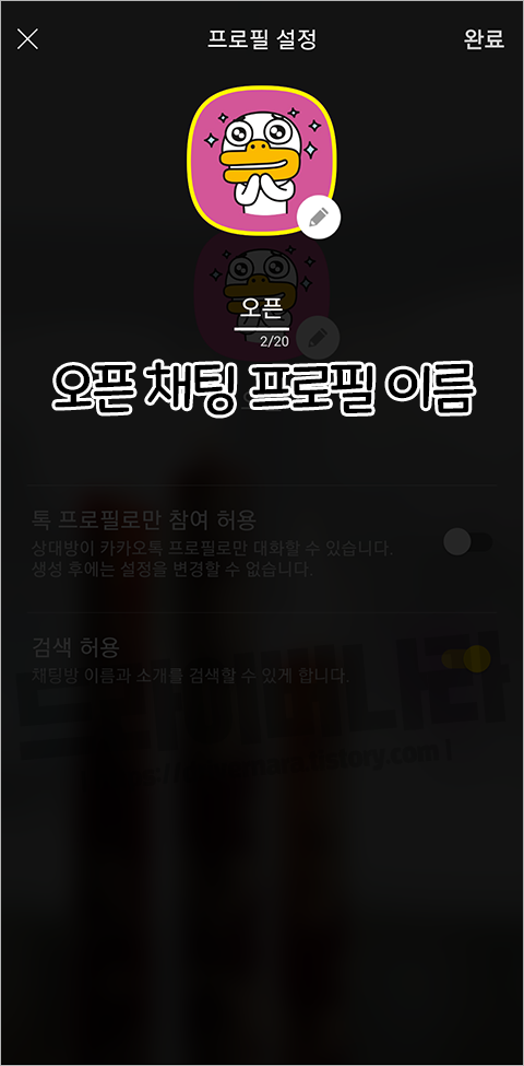 이제 오른쪽 윗부분에 완료 글씨만 누르면 오픈채팅방 만들기가 끝이 납니다.