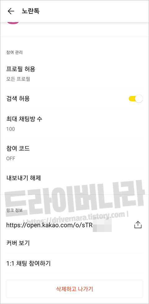 이 곳에서 여러가지 채팅방 설정을 할 수 있습니다. 이 글에서는 1:1 채팅방을 만들기 했는데, 1:1 채팅방도 무려 100개를 만들 수 있고, 공유할 링크도 확인할 수 잇습니다. 뿐만 아니라 가장 하단에 보면 삭제하고 나가기 버튼이 있습니다. 이 버튼을 누르면 오픈채팅방을 종료할 수 있습니다.