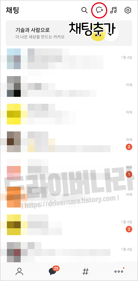 카카오톡 채팅방 대화목록 화면입니다. 친구들 혹은 채널에서 들어오는 메시지 리스트를 이 화면에서 확인할 수 있고 대화방에 직접 들어가서 메시지 내용을 주고 받을 수 있습니다. 이 화면 제일 윗부분에 채팅 추가 아이콘이 존재합니다. 이 아이콘을 눌러 채팅 추가 메뉴를 불러옵니다.